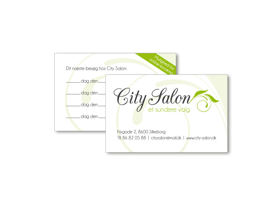 Vi har tegnet et helt nyt logo til salonen, der signalerer en grøn linje, og har lavet visitkort, der samtidig fungerer som 'huskekort' for næste tidsbestilling.